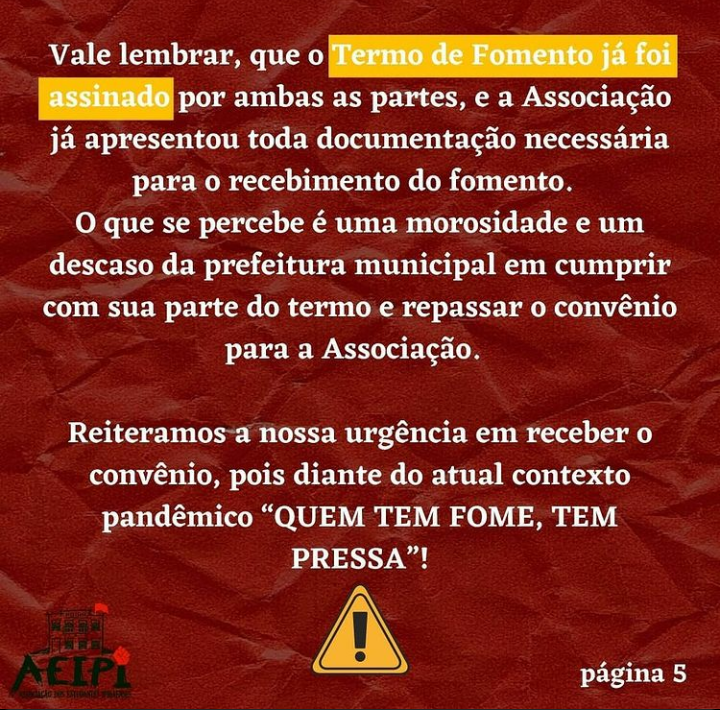 Reiteramos a nossa urgência em receber o convênio, pois diante do atual contexto pandêmico “QUEM TEM FOME, TEM PRESSA”!